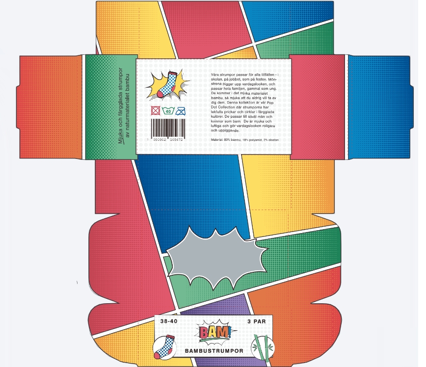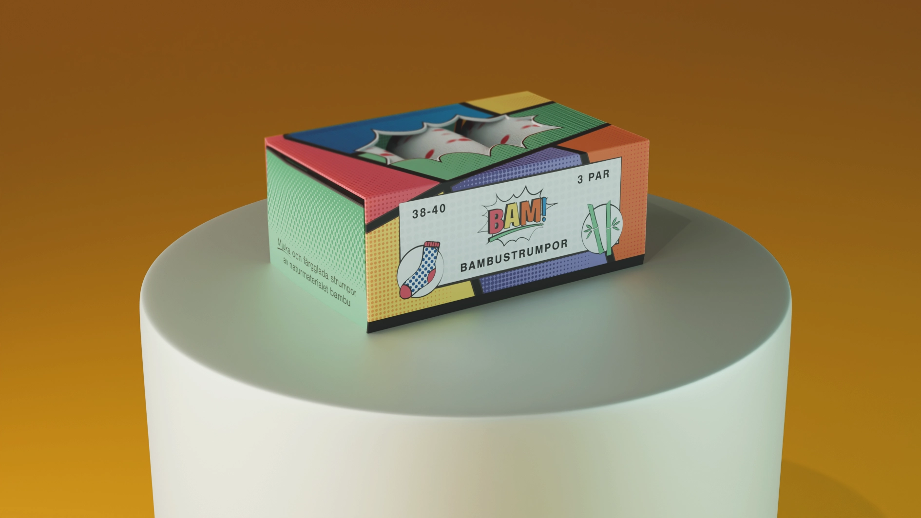 Hur skulle en förpackning för bambustrumpor kunna se ut om den var inspirerad av pop art, och hur skulle man kunna ha en sådan stil utan att kompromissa på funktionalitet och kommunikation? Svaret blev BAM, en prototyp som designats med butikshyllan på Åhléns, miljömedvetenhet och konkurrenter med liknande produkter i åtanke. Lådan är återförslutbar så att den kan användas flera gånger, och visar hur strumporna ser ut samtidigt som de skyddas från omgivningen. Prototypen på bilden är en 3D-modell skapad av mig i Blender. Projektet genomfördes i samarbete med Caroline Seidel, Patricia Karlsson, Lisette Haglund, Lovisa Wäster och Louise Johansson.